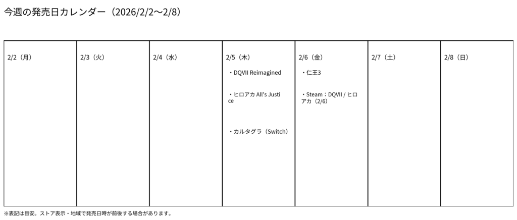 今週(2/2〜2/8)の発売注目は、『ドラクエ7 Reimagined』(2/5)、『ヒロアカ All’s Justice』(2/5)、**『仁王3』(2/6)の大本命トリオ!じっくりミステリー派は『カルタグラ』(2/5)**もアリだよ〜。買う前は、発売日がSteamだけズレるケースもあるから、最終的に公式・ストア表記を見てから決めるのが安心♡