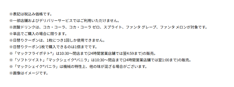 - 一部店舗・デリバリーは対象外(マックデリバリー等は通常価格の可能性)