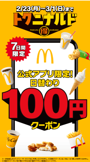 マクドナルドの『トクニナルド』で、**公式アプリ限定の日替わり「100円クーポン」が来るよ〜!期間は2/23(月・祝)〜3/1(日)の7日間。